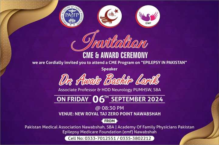 PAFP FAMILYCON NAWABSHAH and PMA NAWABSHAH SBA Chapters with collaboration of Epilepsy Medicare foundation Epilepsymedicarefoundation Nawabshah Organized a CME & Awards Ceremony, The Topic of CME is “EPILEPSY IN PAKISTAN” at New RT Nawabshah , Dr Awais Bashir Larik AP and HOD Neuro Physician PUMHS Hospital Nawabshah presented a Beautiful, practical approach and informative lecture on Epilepsy and its diagnosis, latest update treatment and Prevention of the Disease. On this occasion Prof Dr Shamsudden Shaikh also further added and shared his experience in epilepsy management and appreciated the effort taking by to promote the CME Programs by PMA and PAFP Nawabshah on organizing this Collaborativ Activity. Dr A Razzak Rajper President PMA and Dr Ghulam Qadir Rajput President Academy of Family Physicians Pakistan Explained the views and Welcome to the Participating Doctors Family Physicians and other Health After Scientific session the Distinguished Guests and Participants Doctor awarded the Shields and Gold Medals of Life Time Achievement award on their Continues services to the In the last but not least The Familycon 24 launching ceremony was celebrated with cake cutting.
